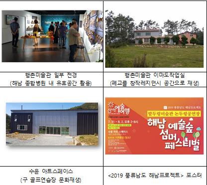행촌미술관, 농촌 유휴공간을 문화재생으로 탈바꿈하다 문체부 장관상을 받은 행촌미술관은 전남 해남종합병원 내 유휴 공간과 섬 지역의 폐교, 지역의 유휴 골프연습장을 각각 미술관과 예술가들의 창작공간, ‘수윤아트스페이스’ 등으로 재생해 연간 10회 이상 전시와 공연, 교육 프로그램을 운영하는 것은 물론 예술가 40여명 이상의 창작 활동을 지원하고 연간 지역 학생 3,000여명 이상에게 예술 체험 기회를 제공했다.