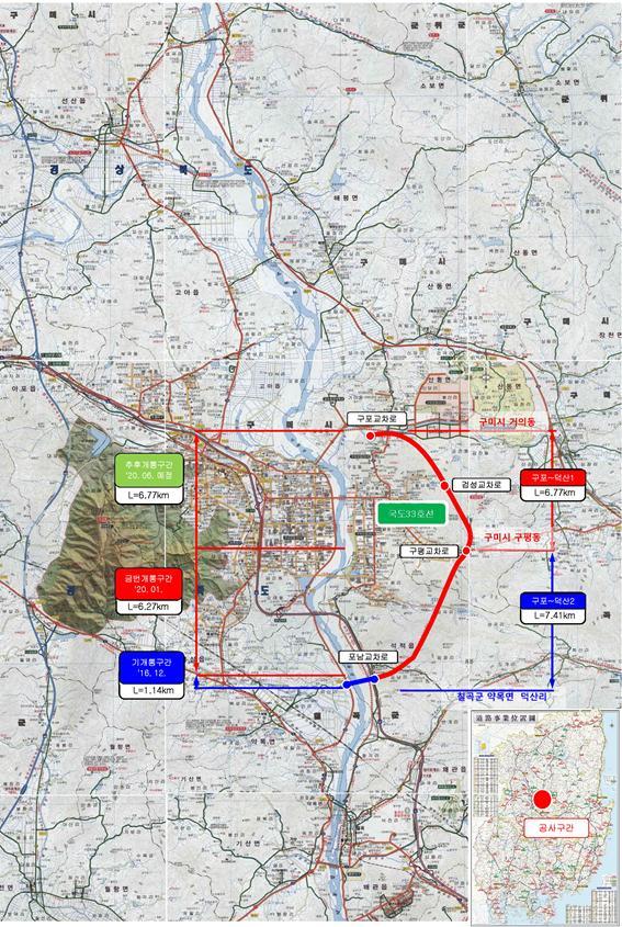 아울러 이번 개통도로의 이후 구간인 구미시 구평동∼구포동도 4차로 도로를 신설하고 있으며 예산과 인력, 장비를 집중 투입해 2020년 6월말 개통 목표로 정상추진 중에 있다.