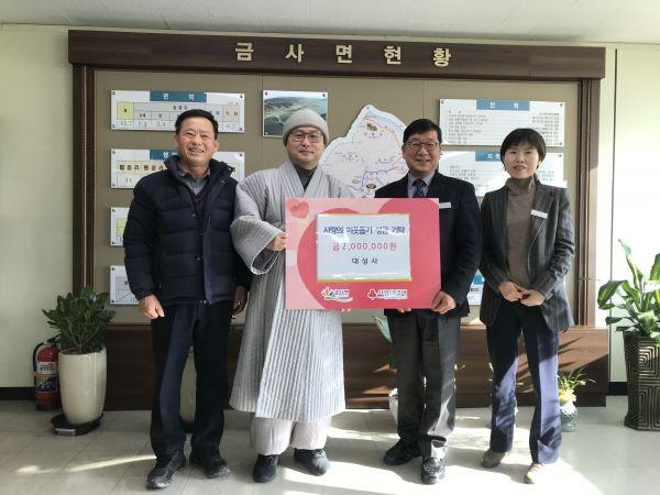 대성사는 지난 13일 금사면행정복지센터를 방문해 이웃돕기 성금 200만원을 기탁했다.