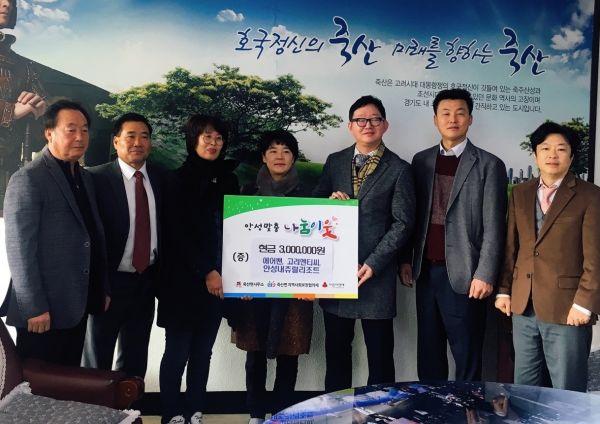 지난 10일 죽산면 관내 기업체 ㈜에어밴, 고려엔티씨, 안성내츄럴리조트 3개 업체 대표는 각 100만원씩 300만원을 지역아동센터 2곳에 각 150만원을 후원했다.