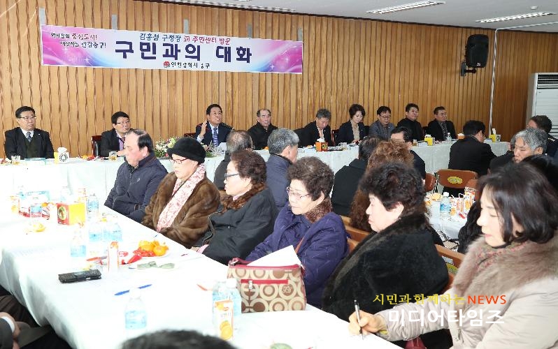 [미디어타임즈=문상수 기자] 인천 중구 김홍섭 구청장은 1월 16일 신포동을 시작으로 23일까지 6일 동안 洞 주민센터를 방문하여 구민과의 대화를 실시한다.구는 이번 방문에서 구민이 느끼고 있는 애로사항 및 불편사항, 지역 현안에 대한 의견을 적극 수렴함으로써 우선 반영할 수 있도록 알찬 대화의 시간으로 진행하며, 또한 구정 비전을 제시, 주민들과의 공감대를 형성하고 이에 대한 적극적인 협조를 당부한다.주요 건의내용으로는 신포역 주변 경관사업 추진 여부 및 계획, 답동소공원 환경 정비, 연안동 풍물 거리 정비, 라이프 아파트 이전 문제, 신흥동 주민센터 신축 이전, 원도심 활성화를 위한 도시재생사업, 도원동 공가 관리, 도원재개발 문제점 인식, 도원동 청사 신축 등 주민들의 생생한 목소리가 전해졌다.세계적인 관광중구 건설의 비전을 제시하고, 현안사항 파악 및 생생한 지역여론을 수렴해 구정에 반영하기 위해 마련된 이번 방문은 23일 용유동 방문으로 마무리 될 예정이다.구 관계자는 “이번 방문을 통해 구정에 대한 주민들의 적극적인 참여를 유도하고 지역발전을 위한 구민들의 역량을 결집시키는 계기가 될 것”이라고 말했다.