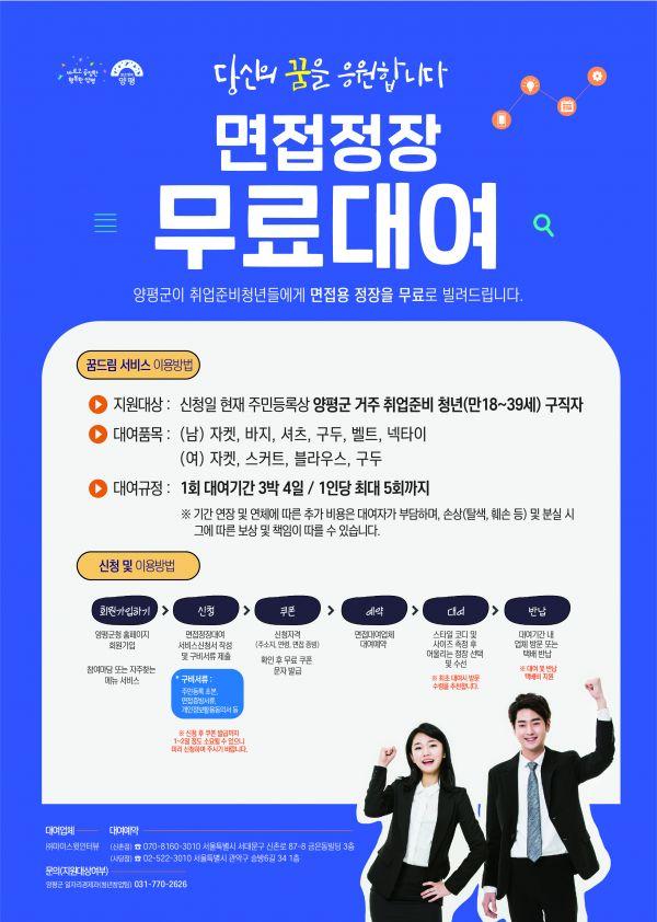 양평군은 지난 6일 마이스윗인터뷰와 업무협약을 체결하고 ‘양평청년 꿈Dream 지원 서비스’로 면접정장 무료대여를 시작했다.
