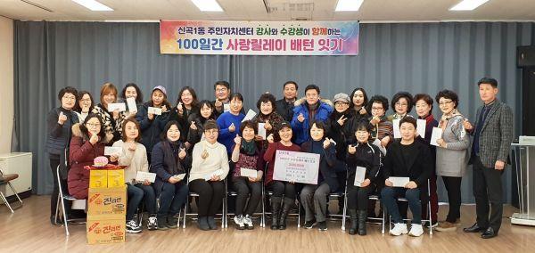 신곡1동 주민자치센터 강사와 수강생 20여명은 지난 13일 100일간 사랑릴레이 배턴 잇기 운동의 일환으로 지역 내 어려운 이웃에게 전달해 달라며 성금 300여만원과 라면 2상자 및 기타 물품을 기탁했다.