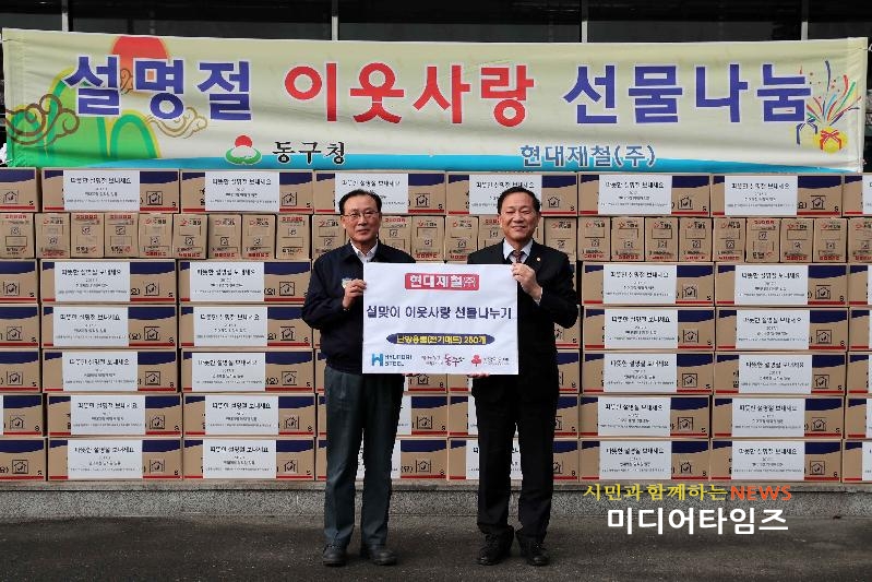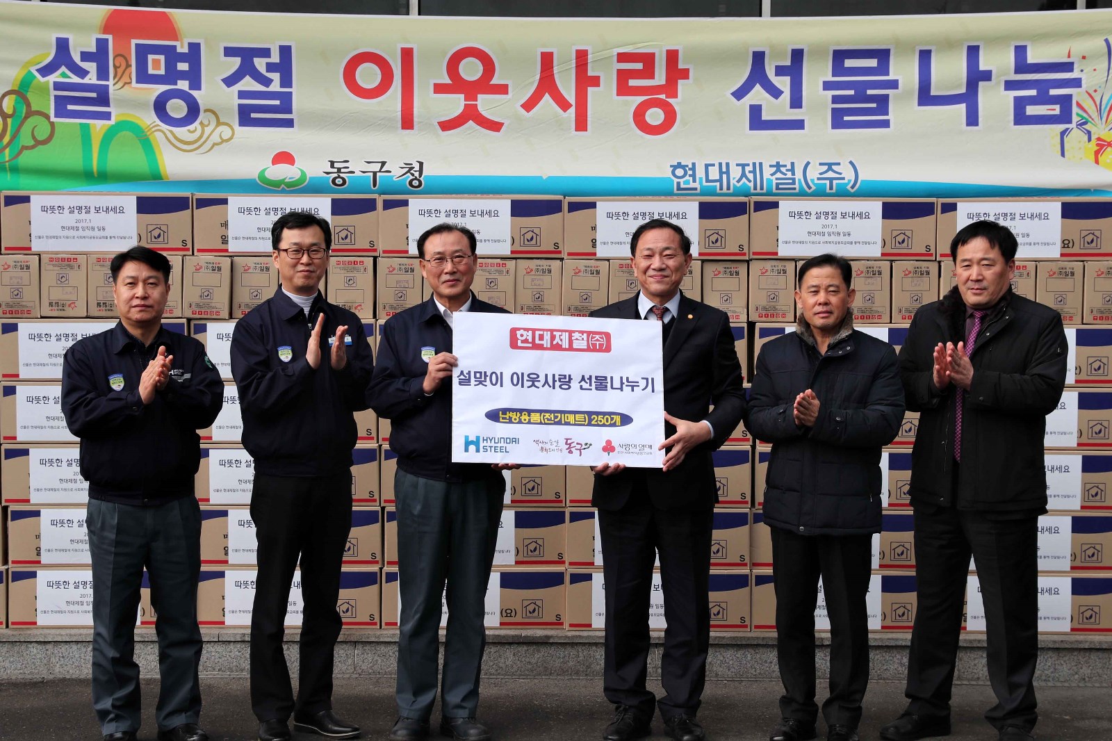 [미디어타임즈=문상수 기자] 인천 동구(구청장 이흥수)와 현데제철 인천공장(공장장 오태하)은 지난18일 현대제철 인천공장에서 설맞이 이웃사랑 선물 나누기 전달식을 개최했다.전달식에는 구남회 부구청장과 오태하 현대제철 인천공장장을 비롯한 임직원이 참석했으며, 현대제철 인천공장은 민속 명절 설을 맞이해 동구 관내 이웃들을 위한 전기매트 250개를 지원했다.지원된 물품은 난방시설이 부족해 추위를 겪고 있는 어려운 어르신과 아동에게 전달됐다.전달식에 참석한 오태하 공장장은 “추운 계절이지만 현대제철 임직원의 정성과 따뜻한 마음이 난방용품으로 전달되어 건강한 겨울을 나는 데 도움이 됐으면 좋겠다”고 말했다.