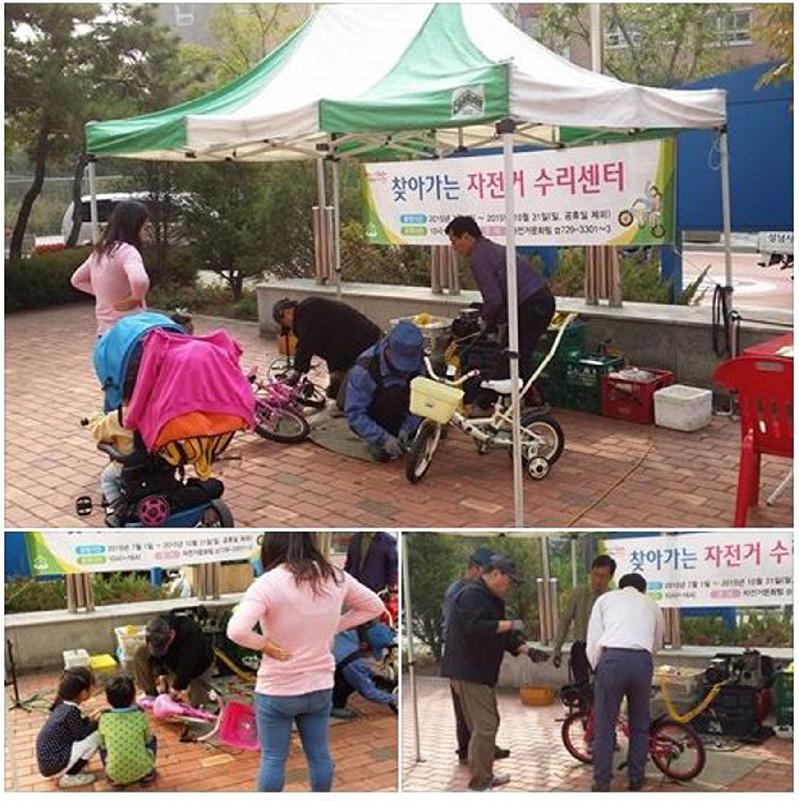 | 자전거 정비소에서 일하고 있는 지역공동체 일자리 사업 참여자들 사진.<사진=성남시청 제공> |