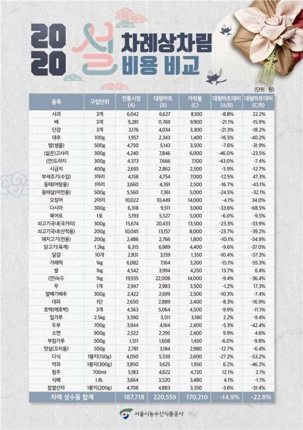 서울시농수산식품공사는 알뜰한 설 명절 준비에 도움이 되는 정보를 제공하기 위해 서울시내 25개구 전통시장, 대형마트 및 가락시장 내 가락몰 등 총 76곳을 대상으로 2020년 설 차례상차림 비용을 조사·발표했다.