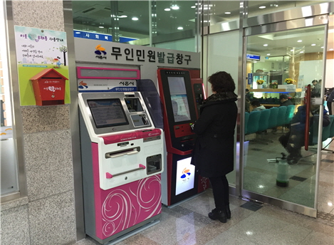행정복지센터에 설치된 2대의 민원발급기는 지난해 4만 510건의 이용실적을 거두었으며 현재 이마트, 롯데마트, 세무서에도 무인민원발급기가 설치되어 있어 66종의 민원서류를 발급받을 수 있다.