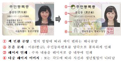 아울러 내용이 쉽게 지워지지 않도록 레이저로 인쇄했으며 왼쪽 하단은 보는 각도에 따라 흑백사진과 생년월일이 나타나는 다중 레이저 이미지가 적용돼 위·변조가 더욱 어려워졌다.