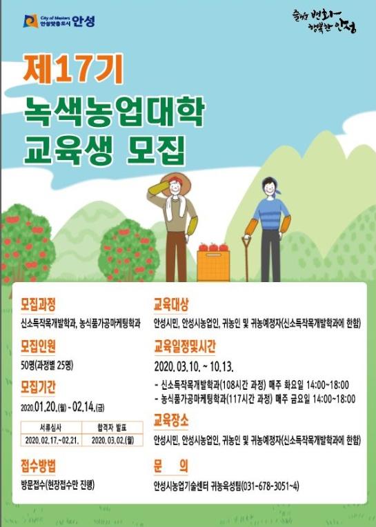 안성시농업기술센터는 오는 20일부터 녹색농업대학 교육생을 50명을 모집한다.