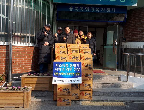평택시 송탄민속5일장 상인회은 15일 라면 50박스 을 저소득 가정에 전달해 달라고 송북동에 기탁했다.