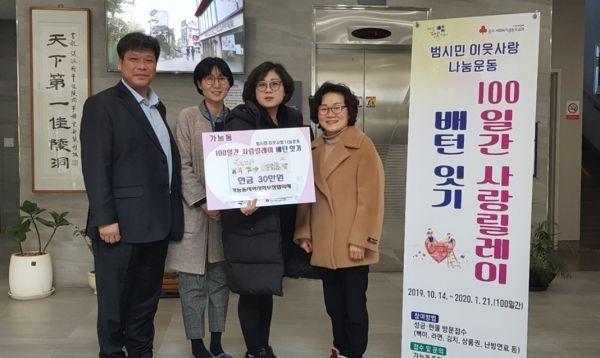 가능동 지역사회보장협의체는 지난 14일 동 주민센터를 방문해 성금 30만원을 의정부 범시민 사랑 나눔 운동인 100일간 사랑릴레이 배턴 잇기에 기부했다.