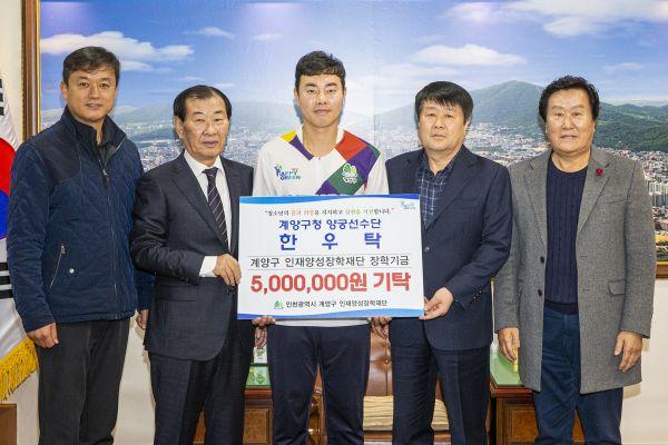 인천 계양구 양궁선수단 한우탁 선수는 15일 계양구청을 방문해 지역인재육성을 위해 써달라며 장학금 500만원을 기탁했다.