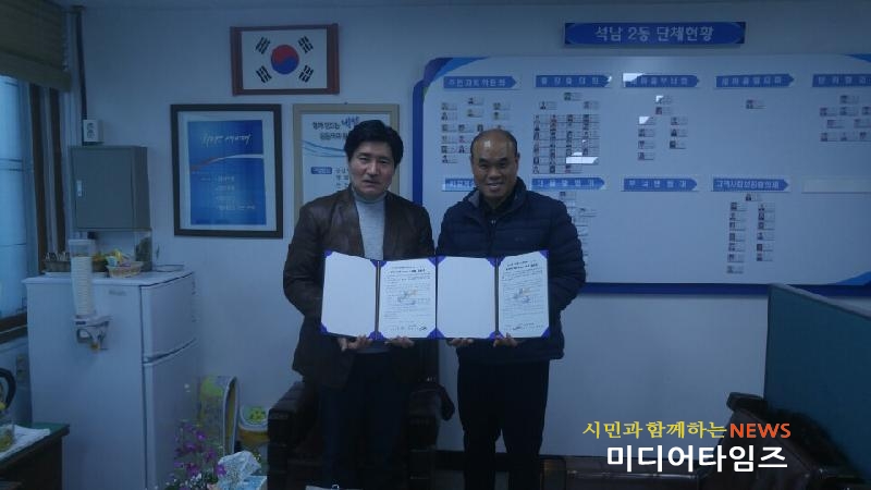 | 석남2동센타와 JS노송병원상호협력과 발전을 위한 메세나 협약식을 체결하는 모습. <사진=미디타임즈> |