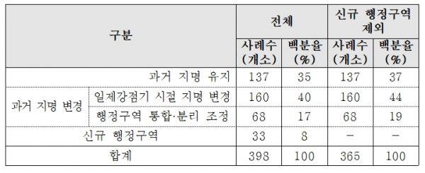 그 결과 과거 지명이 현재까지 유지된 읍·면·동은 137곳이고 해방 전이나 해방 후를 포함해 지명이 변경된 읍·면·동은 228곳으로 분석됐다.