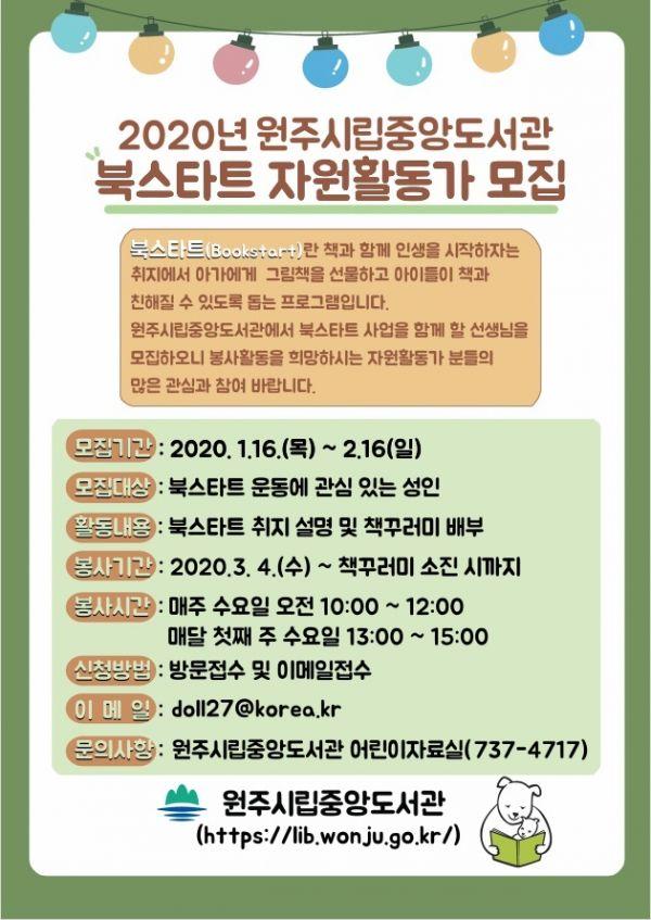 원주시립중앙도서관이 2020년 북스타트 활동에 참여할 자원활동가를 16일부터 오는 2월 16일까지 모집한다.