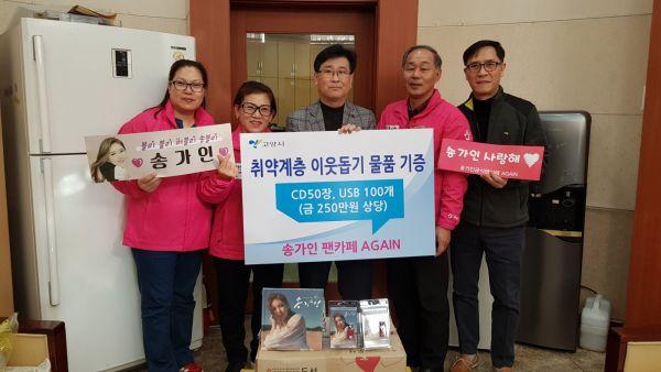 고양시는 지난 15일 ‘송가인 팬카페 AGAIN 경기북부지부’에서 취약계층을 위해 250만원 상당의 후원품 송가인 음악앨범CD 40장과 USB 100개를 기증했다고 밝혔다.