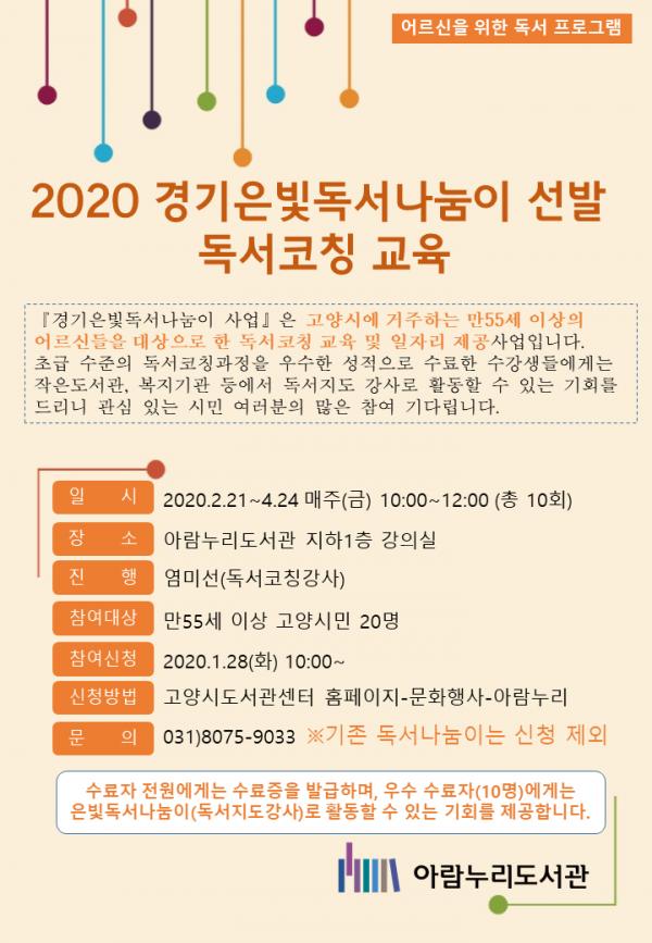 고양시는 시립아람누리도서관에서 오는 2월 21일부터 매주 금요일에 실버독서지도자 양성 프로그램 ‘2020년 은빛독서나눔이 선발 독서코칭 교육’을 운영한다고 16일 밝혔다.