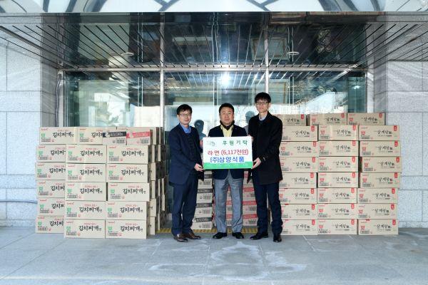 먼저 ㈜삼양식품에서는 611만원 상당의 컵라면 150박스와 초코바 50박스를 전달했으며 원조멸치국수에서는 시가 261만원 상당의 국수 소면을 관내 저소득층 어르신들을 위해 기부했다.