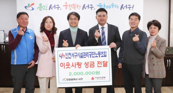 인천서구시설관리공단 노동조합은 설 명절을 앞둔 지난 15일 인천 서구를 방문해 이웃사랑 후원금 2백만원을 전달했다.