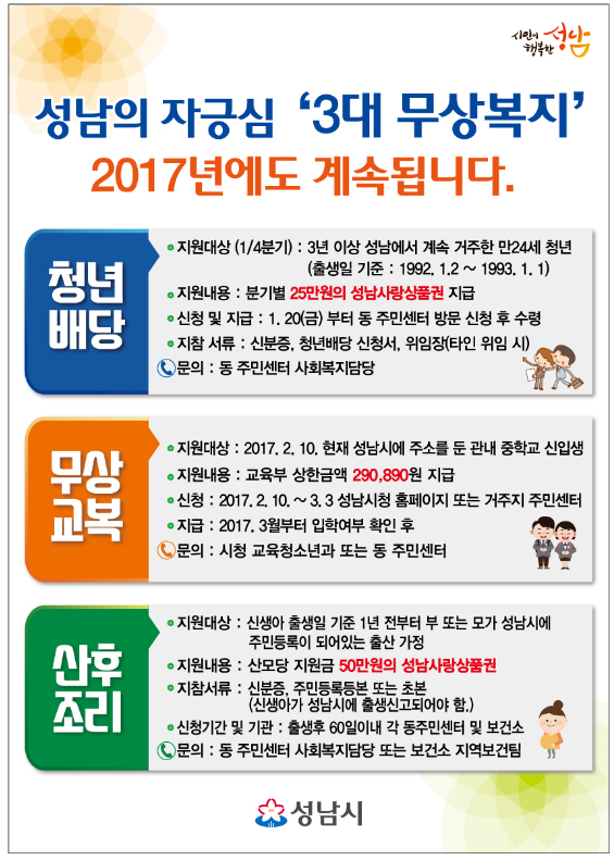 성남시는 지난해 1분기 10,574명, 2분기 10,452명, 3분기 10,573명, 4분기 10,388명에게 청년배당을 지급했다. 교복구입지원금도 중학교 신입생 8,561명과 저소득계층 고등학교 신입생 444명 등 모두 9,005명에게 지급했으며 6,752명의 산모에게 산후조리지원금을 지급했다.