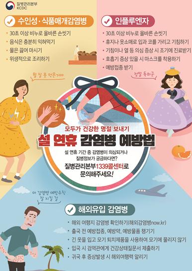질병관리본부는 설 연휴 기간 가족, 친지 방문 및 국내·외 여행 증가에 따른 감염병 발생을 예방하기 위해 ‘설 연휴 감염병 예방수칙’을 준수할 것을 당부했다.