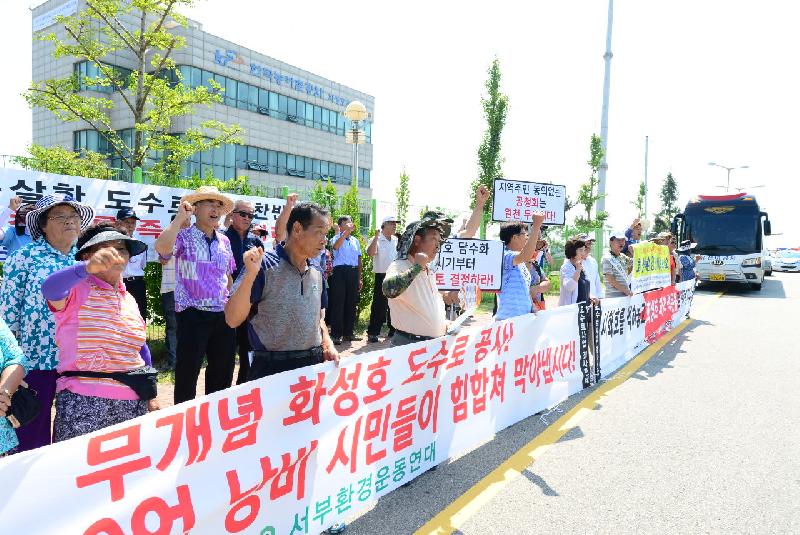 집회에 나선 화성시민들은 화성호 담수화 시기가 미 결정된 상태에서 농수제공용 도수로 건설은 부적절한 사업이라고 한 목소리를 냈다.