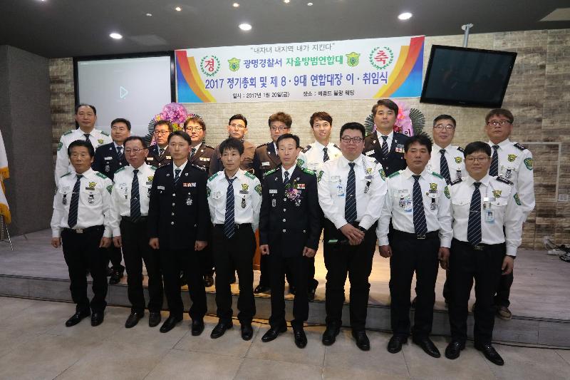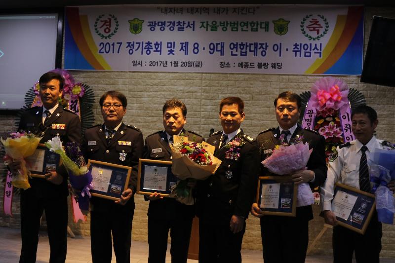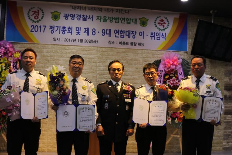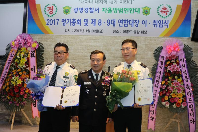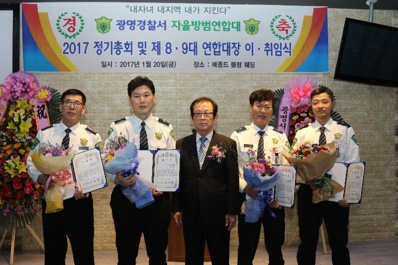 이날 자율방범연합대장 이·취임식은 박재철 사무국장 사회로 진행, 노국상 방범국장의 「자율방범 행동강령」 낭독 후, 이어 지난 한해 방범 활동에 헌신한 우수대원에 대한 광명시장, 광명시의회 의장, 국회의원, 경기도 의장, 도의원, 경찰서장 등 표창장과 감사장을 수여했고 자율방범연합대 旗 이양식, 신임대장 추대패 및 계급장 배지 수여, 연합대장 선서, 전임대장 공로패 전달, 케이크 커팅 및 건배 제의로 행사를 마쳤다.