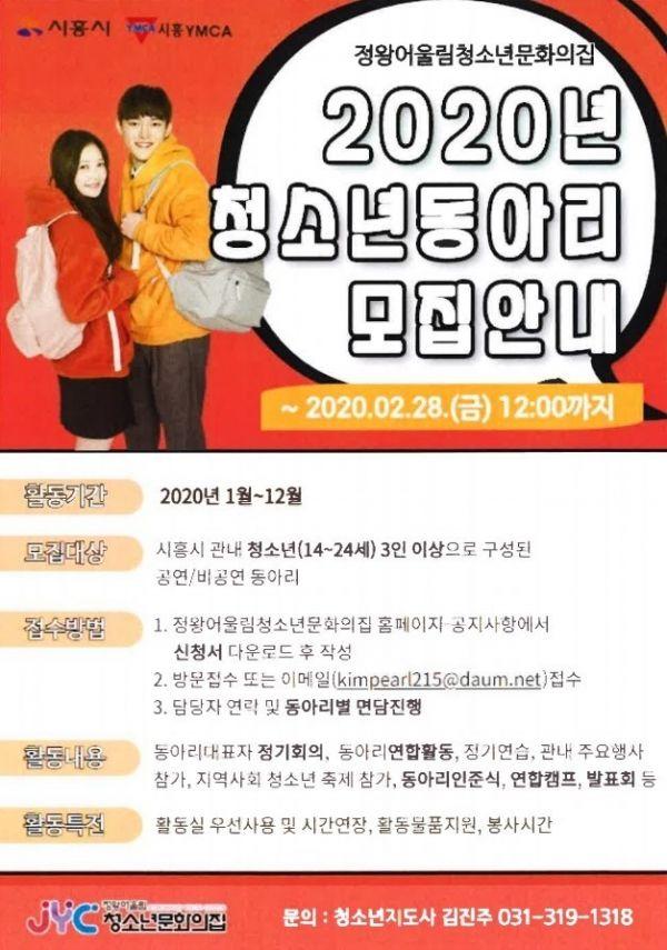 시흥시 정왕어울림청소년문화의집은 2020년도 시흥시 청소년들의 문화·예술 등 다양한 활동 활성화를 위해 ‘청소년동아리’를 오는 2월 28일까지 모집한다.