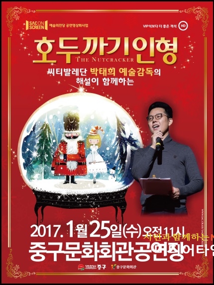 [미디어타임즈=문상수 기자] 예술의 전당 최고의 발레 공연을 인천 중구문화회관에서 영상으로 만나볼 수 있게 돼 화제다. 인천 중구문화회관은 지난해부터 매월 SAC On Screen 사업의 일환으로 예술의 전당 주요공연을 스크린으로 상영하고 있다.SAC On Screen 이란‘예술의 전당 공연 영상화 사업’으로 서울 예술의 전당 우수 공연을 대형 스크린을 통해 온국민이 함께 보고 즐기며 지역문화의 격차를 좁히기 위한 프로젝트다.중구문화회관은 1월 25일 문화가 있는 날을 맞아 『호두까기 인형』을 시작으로 매월 새로운 작품을 선보일 예정이다.중구문화회관 관계자는 이번 공연은 VIP석에서도 볼 수 없는 출연진의 생생한 표정과 몸짓을 10대이상의 카메라 앵글로 현장감 있는 화면을 만들어내, 일반 공연 실황과는 차원이 다른 생동감 넘치는 영상을 스크린 속에 가득 담아 낼 예정이며 인천시티발레단 박태희 예술감독의 재미있는 해설이 더해져 더욱 특별한 자리가 될 것이라고 전했다.1월 25일 오전 11시 첫 상영작 호두까기 인형은 중구문화회관 홈페이지에 공연관람 신청 게시판에 무료로 신청 가능하며 공연과 관련하여 자세한 사항은 중구 문화회관 홈페이지(http://artcenter.icjg.go.kr), 또는 전화 (☎032-760-6426~7)로 문의하면 된다.