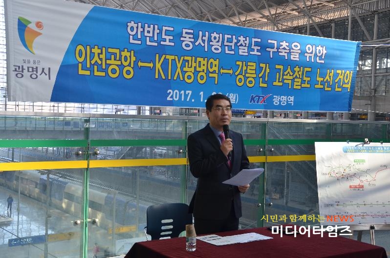 양 시장은 또 “저와 광명시는 2011년 8월 평창올림픽 개최 확정 직후 인천공항에서 KTX광명역을 거쳐 평창(강릉)까지 가는 고속철도 건설을 건의했지만 정부는 건설비용과 공사기간 등을 이유로 이를 받아들이지 않았다”며 정부가 내년 2월 평창올림픽을 위해 결정한 철도노선(인천공항-서울지역-청량리역-평창- 강릉)은 대회 선수단과 관광객 등을 염두에 둔 것으로 동서횡단철도 기능을 하기엔 한계가 있다”고 지적했다.