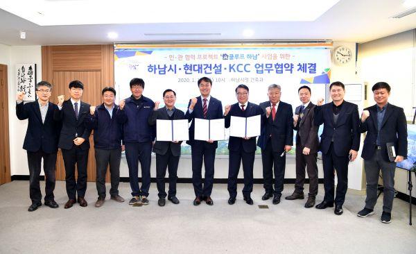 하남시는 17일 시장실에서 민·관 협력 프로젝트‘쿨루프 하남’사업을 위해 현대건설㈜, ㈜KCC와 업무협약식을 가졌다.