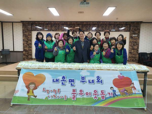 강성모 내촌면장은 “나보다는 힘든 사람을 먼저 생각하는 마음으로 내가 가진 1%를 어려운 이웃과 나누어 따뜻한 마음을 보여주신 분들께 감사드린다”며 “추운 겨울날 부녀회원들의 나눔봉사가 어려운 이웃들에게 행복과 희망의 불씨가 되길 바란다”고 말했다.
