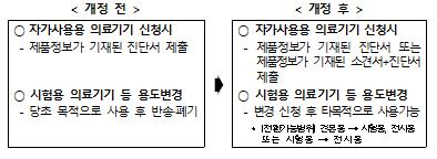 주요내용은 자가사용용 의료기기 신청시 진단서 외 소견서 허용 시험용 의료기기 등의 용도 변경 허용 시험용 의료기기의 인정범위 확대 등이다.