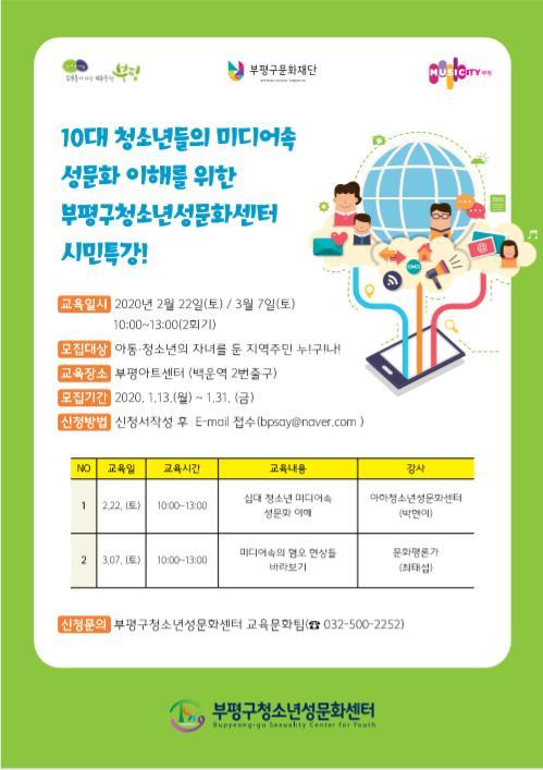 부평구 청소년성문화센터는 오는 2월 22일과 3월 7일 부평아트센터에서 청소년들의 디지털 성문화를 이해하고 미디어 속의 혐오현상들에 대해 이해하고 알아보는 강연을 준비했다.