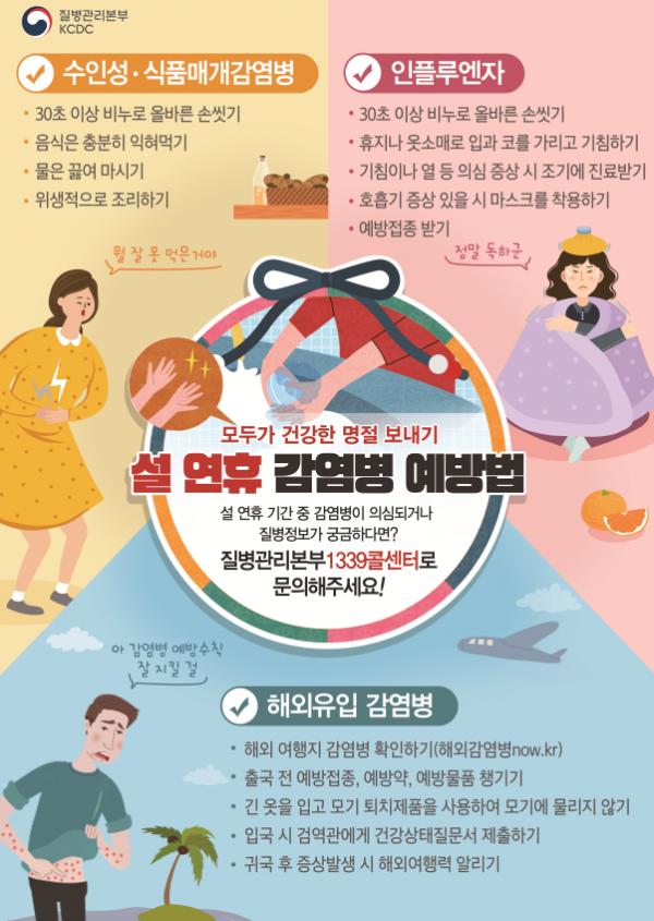 국내에서는 명절 기간 동안 상온에 장시간 노출되어 부패할 수 있는 음식의 공동섭취 및 사람 간 접촉 증가로 발생위험이 높은 A형 간염 등 수인성·식품매개감염병과 인플루엔자 등에 유의해야 한다.