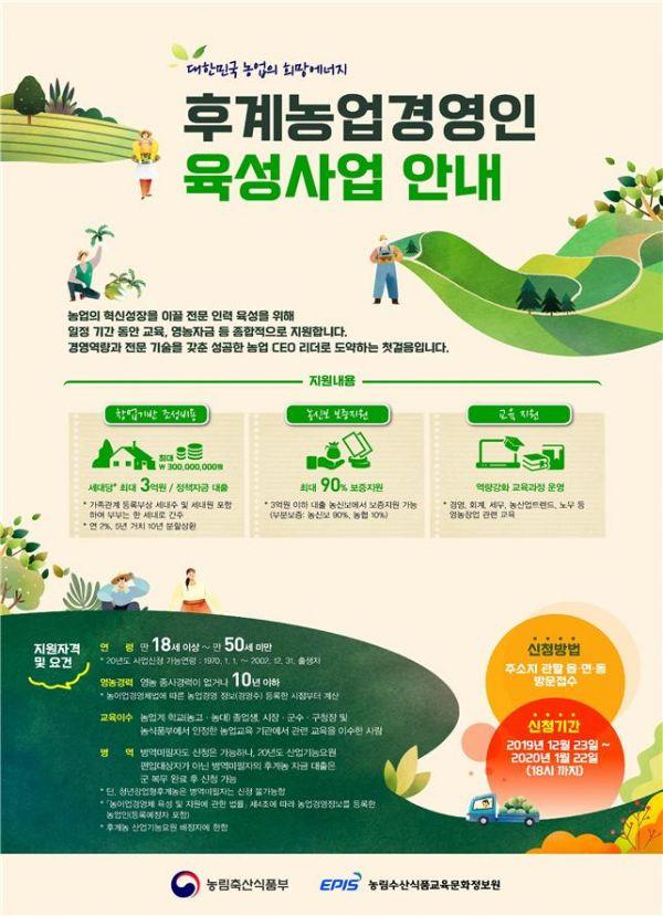 후계농에게는 최대 3억원 창업자금 지원, 청년창업농에게는 영농정착금 80~100만원을 지원한다.
