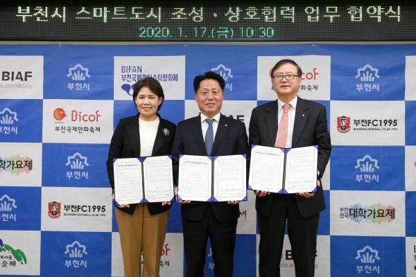 부천시가 17일 오전 시청 만남실에서 한국클라우드사업협동조합, 부천도시공사와 스마트도시 조성 및 상호발전을 위한 협약을 체결했다고 밝혔다.