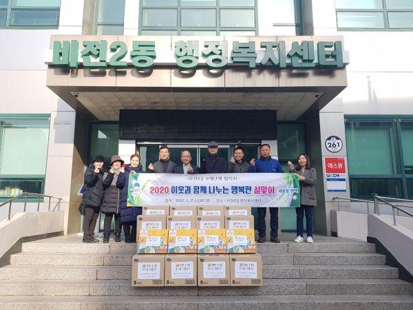 한편 비전2동 9개단체 협의회는 매년 명절에 관내 어려운 이웃을 위해 후원물품을 지속적으로 지원해 따뜻한 이웃사랑을 실천하고 있으며 작년 11월에는 기업의 김장김치 후원 감소 등에 따라 단체에서 십시일반 기금을 모아 관내 저소득 115가구에 김장김치를 전달했다.