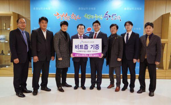 충남교육청은 17일 블리스네트웍스, 행복나눔밥차로부터 노인복지시설 기증용 비트즙 150상자를 기탁받았다.