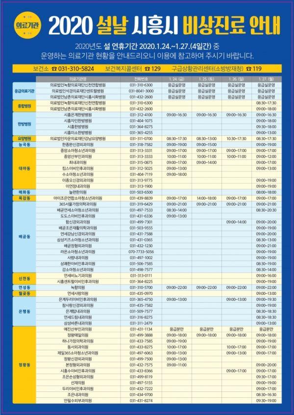설명절 연휴기간 중 비상진료에 대한 내용이나, 인근지역 당직의료기관 및 휴일지킴이 약국 연락처 등에 대해서는 시흥시 보건소나 보건복지콜센터, 구급상황관리센터, 시도 콜센터를 이용하면 안내 받을 수 있다.