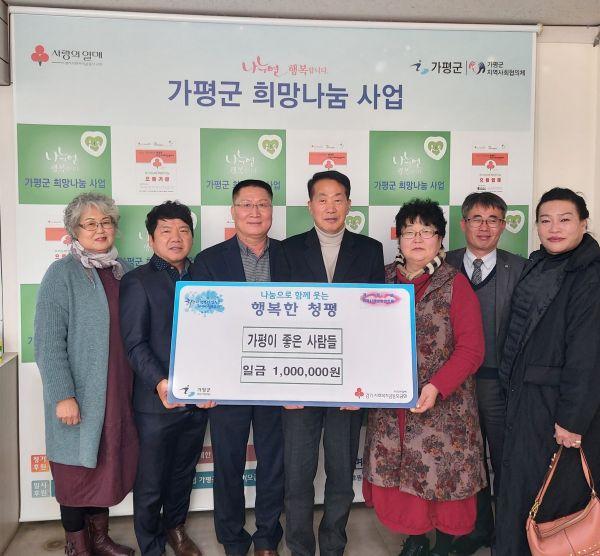 ‘가평이 좋은 사람들’은 가평을 사랑하는 17명으로 구성된 단체로 청평면에 이웃돕기 성금 100만원 기탁을 시작으로 가평군 관내에 도움이 필요한 읍·면에 성금을 기부할 예정이다.