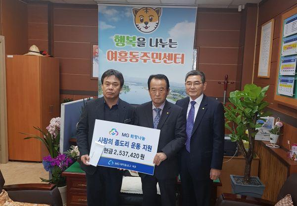 여주새마을금고은 지난 17일 여흥동 행정복지센터를 방문해 어렵고 소외된 이웃에게 전해 달라며 ‘MG 희망나눔 사랑의 좀도리 운동’으로 모은 성금 253만원을 기탁했다.