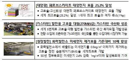 그간의 기술개발을 통해 2019년에는 차세대 태양광전지 세계 최고 효율 달성, 270MW급 대형 가스터빈 국산화 성공, 화력발전소 미세먼지 집진 효율 10배 향상기술 개발의 성과를 도출했다.