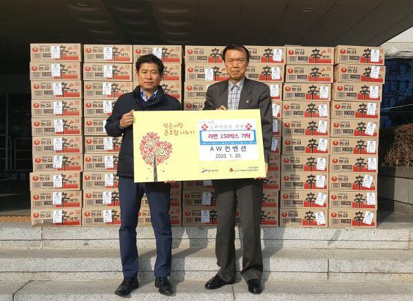 안산시는 설 명절을 앞두고 이웃사랑 후원으로 AW컨벤션으로부터 라면 150박스를 기탁받았다고 21일 밝혔다.