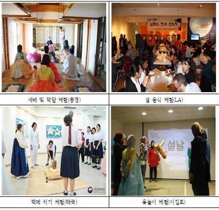 한국문화원에서는 한국 전통문화를 접하기 어려운 아시아, 미주, 유럽, 아프리카 등, 각국 현지인들이 떡국과 설빔, 세배, 전통놀이 등, 설 풍습을 직접 체험할 수 있는 다채로운 행사를 마련해 ‘설’의 온정과 흥겨움을 함께 나눈다.