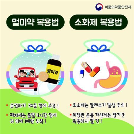 설 명절에는 고향을 찾아 멀리 이동하는 경우가 많은데 멀미를 예방하기 위해 사용하는 멀미약은 졸음이 오거나 방향 감각을 잃는 등의 부작용이 나타날 수 있으므로 주의해야 한다.
