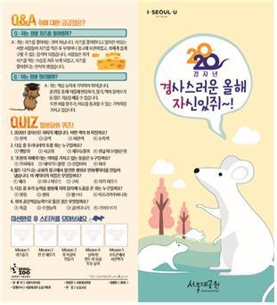 쥐의 모든 것을 배워보는 시간 쥐에 대해 5가지 미션을 수행하면서 쥐에 대한 재미있고 유익한 지식을 쌓아보자 또한 가족과 함께 ‘희망 쥐 포토존’에서 새해 소망과 함께 sns에 행복한 사진을 남겨보자 5가지 미션은 리플렛 읽고 퀴즈 풀기, 쥐 목걸이 만들기 또는 빈칸 채워 문장 완성하기, 날아라 열두 띠 동물 투호놀이, 희망쥐 포토존에서 사진찍기 중 3가지 이상 미션 완료시 소정의 기념품도 받을 수 있다.