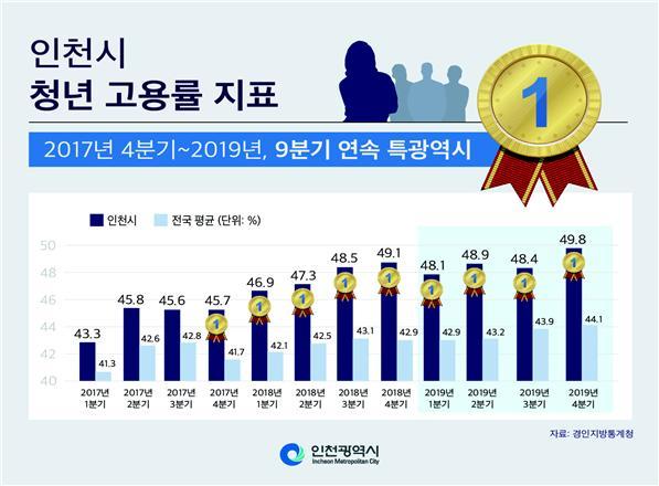 2019년 3분기 인천의 청년고용률은 48.4%, 4분기는 49.8%로 오름세며 동기간 전국 평균은 43.9%, 44.1% 수준이다.