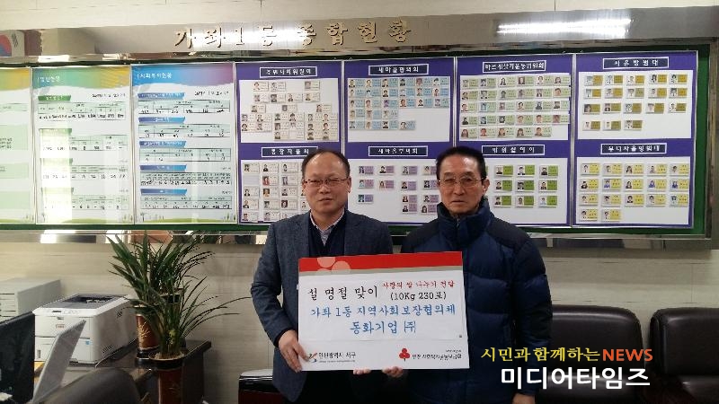 [미디어타임즈=문상수 기자] 인천 서구 가좌1동(동장 손진승)에 위치한 동화기업(주)은 2017년 설 명절을 맞아 지난 23일 가좌1동 주민센터에 사랑 나누기 쌀 230포를 전달했다. 가좌1동에 소재하고 있는 동화기업(주)은 그 동안 지역의 어려운 이웃을 위해 후원금 전달 및 물품지원 등 지속적인 후원을 실천해 오고 있으며, 이번 설 명절을 맞이하여 소외된 이웃에게 사랑 나눔을 실천하고 희망을 주고자 「사랑나누기 쌀 230포」를 전달하였다. 동화기업 관계자는 “설 명절 우리 주변의 소외된 가정에 조금이나마 도움이 되었으면 한다.”며 앞으로도 지속적인 나눔 활동을 다짐했다.손진승 가좌1동장은 “쌀 전달에 감사드리며, 전달된 쌀은 명절을 맞아 소외된 어려운 이웃을 위해 사용되어 따뜻한 사회의 소중한 밑거름이 될 것이다.” 라며 감사의 마음을 전했다.