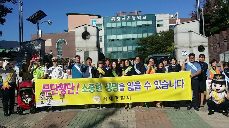 거제경찰서(서장 김영일)는 10일 거제시 고현동 중곡초등학교 정문에서 ‘학교폭력 예방 및 안전한 등굣길을 위한 교통 캠페인’을 실시했다. 이날 행사에는 학교전담경찰관, 거제시 녹색어머니회, 중곡초 학부모회, 교직원 등 40여명이 참여하여 학생들의 학교폭력 선제적 예방과 안전한 등굣길이 될 수 있도록 홍보하였다. 학생들은 포돌이·포순이 연필, 물티슈 등 학교에서 유용하게 사용할 수 있는 홍보물을 받으면서 포돌이 포순이와 함께 기념사진을 촬영하는 등 즐거운 등굣길을 만들었다. 거제경찰서에서는 2학기 초반 학교폭력근절 분위기를 몰아가기 위해 거제시 관내의 초·중·고등학교 60여 곳에서 9월중 매일 캠페인 행사를 진행하면서 학생들의 학교폭력 예방과 안전한 등굣길을 만들기 위해 노력하고 있다.